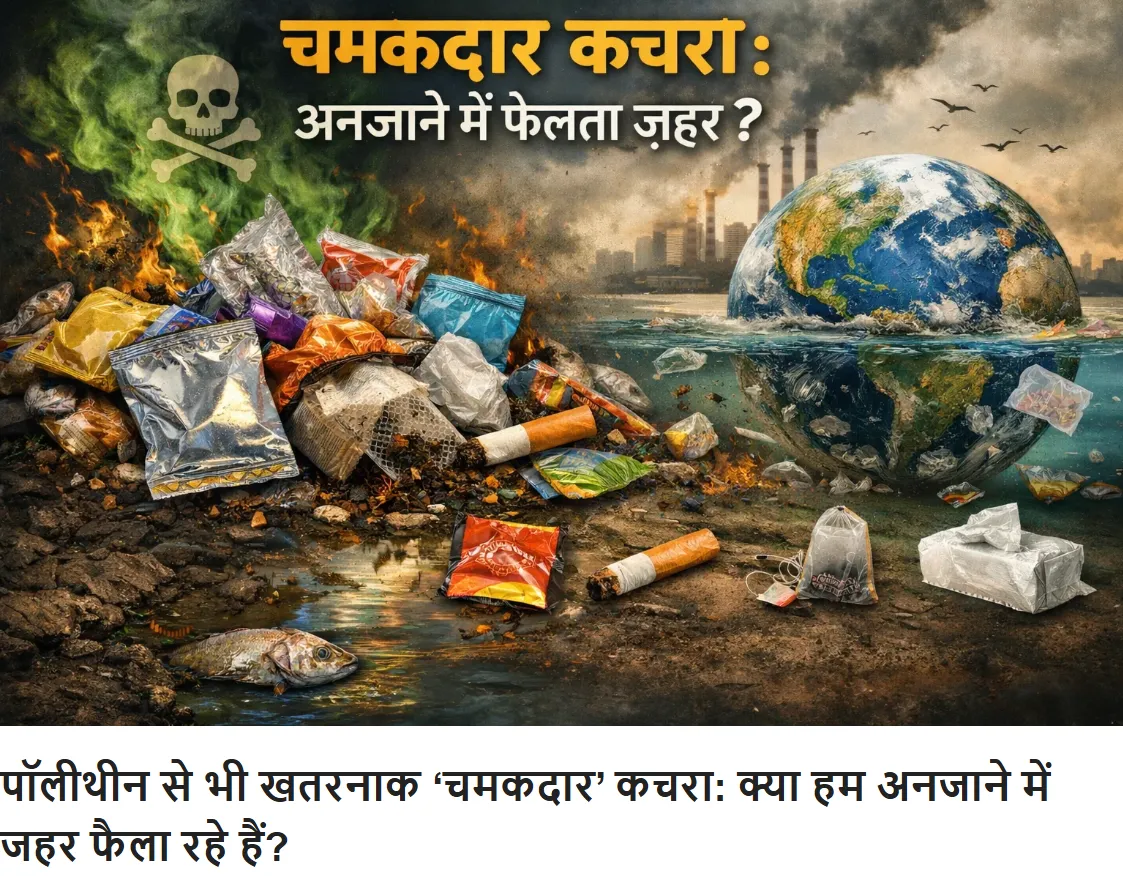 पॉलीथीन से भी खतरनाक ‘चमकदार’ कचरा: क्या हम अनजाने में जहर फैला रहे हैं? - डॉ. अंजुलिका जोशी वर्षों से पर्यावरण संरक्षण के आंदोलनों में पॉलीथीन बैग को ही मुख्य ‘खलनायक’ माना गया है। हम गर्व के साथ कपड़े के थैले लेकर बाजार जाते हैं और यह मान लेते हैं कि पर्यावरण की जंग जीती जा रही है। बेशक, पतली पॉलीथीन पर प्रतिबंध एक सराहनीय कदम था, लेकिन इसने हमारी सामूहिक चेतना में एक ‘ब्लाइंड स्पॉट’ (अंध बिंदु) पैदा कर दिया है। हम कैरी बैग्स पर इतने केंद्रित हो गए हैं कि हमने अपनी रसोई, बाथरूम और जेबों में जगह बनाए बैठे अन्य ‘सिंगल-यूज़ प्लास्टिक’ की उस विशाल सेना को नजरअंदाज कर दिया है, जो पॉलीथीन से भी कहीं अधिक घातक है।